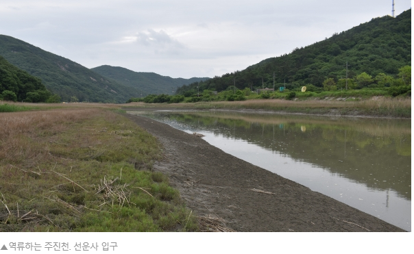주진천은 하류에 댐이 없어 밀물 때가 되면 바닷물이 역류하여 내륙으로 거슬러 올라가 작지만 훌륭한 기수역을 형성한다. 취재팀은 조수차가 크지 않은 조금 때인데도 주진천 하구에서 4km 들어간 선운사 입구에서 상류로 치고 올라가는 바닷물을 확인했다.