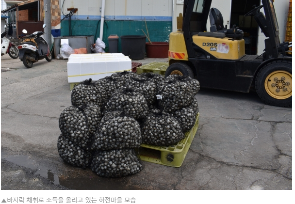 ▲바지락 채취로 소득을 올리고 있는 하전마을 모습