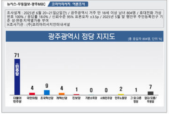 2025.06.12 광주 여론조사. 지지 정당 .민주당 71, 국민의힘 4, 조국당 9, 개혁신당 4, 진보당 1, 기소당 0, 사민당 0, 민주노동당 2, 모름 7