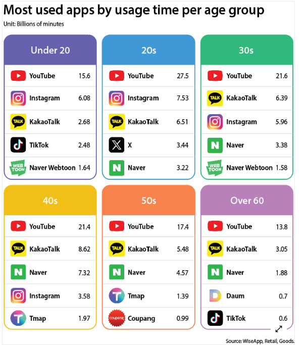 연령별로 사용 시간이 가장 많은 앱.