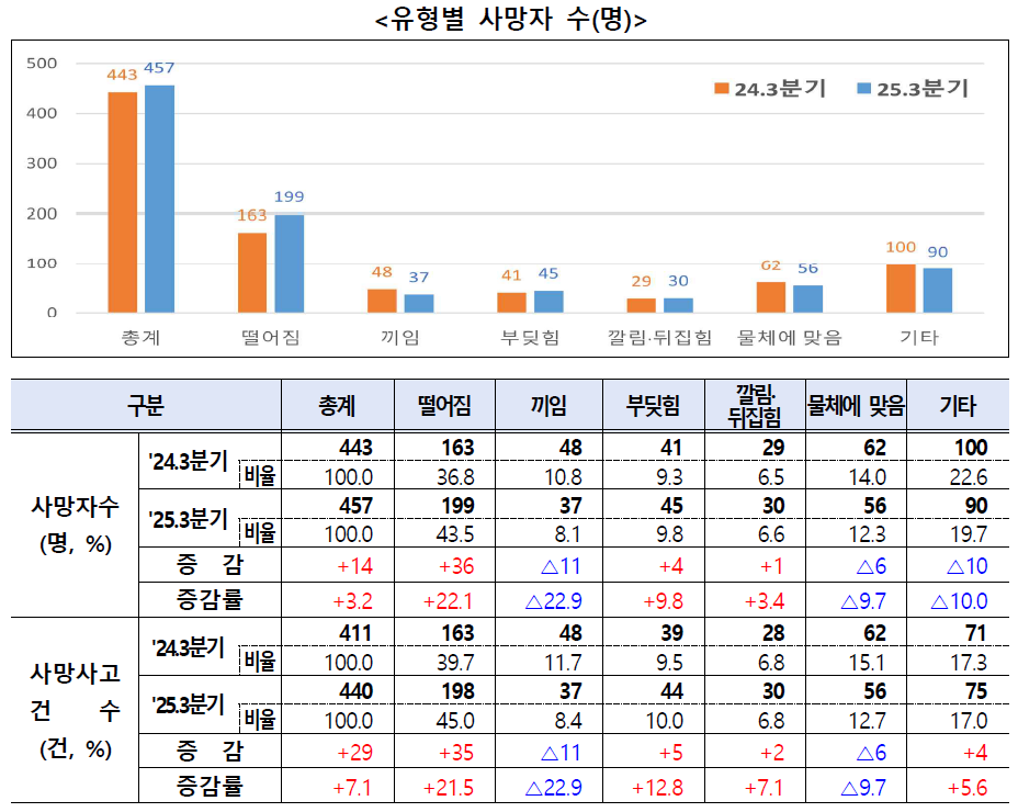 2025년 3분기(누적) 재해조사 대상 사고사망자는 457명(440건)으로 전년 동기 443명(411건) 대비 14명(3.2%) 증가
