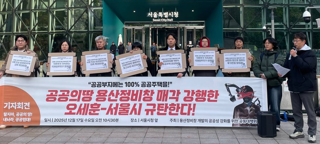 | 서울 시민의 땅, 용산정비창 토지 매각 강행 오세훈 시장 반대 시위에 적극 찬성한다.“서울도심 공공임대주택 대폭 확대 등 공공부지에 100% 공공주택 공급하라” (1) | 2025.12.16 |