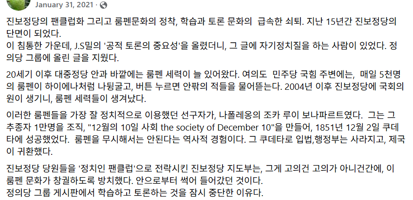 진보정당의 팬클럽화 그리고 룸펜문화의 정착, 학습과 토론 문화의 급속한 쇠퇴. 지난 15년간 진보정당의 단면이 되었다.