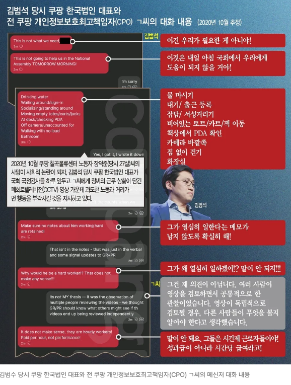 17일 한겨레가 입수한 김 의장과 쿠팡 전 시피오(CPO·개인정보보호 최고책임자) 미국인 ㄱ씨와의 2020년 10월 ‘시그널’ 메신저 대화 내용을 보면, 쿠팡 한국 법인 대표였던 김 의장은 국회 국정감사를 앞두고 장씨의 근무 모습이 담긴 폐회로텔레비전(CCTV) 영상 가운데 회사 쪽에 유리한 대목만 부각시키라고 지시했다.