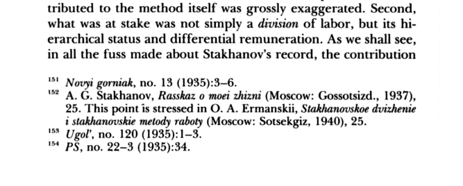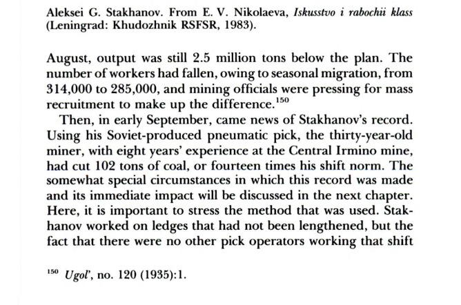 (1) (바자노프) 1935년 1월, 바자노프는 돈바스 지역 '석탄산업 중앙관리국장'이었고, 그는 소련 탄광 노동 분업이 생산량을 획기적으로 늘린다고 보고, 여러가지 실험들을 지시했다.