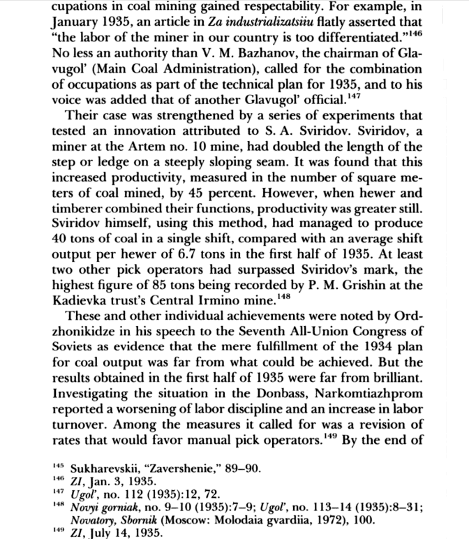 (2) 스비리도프는 당시 돈바스 이르미노 탄광 당행정관료 (아파라치) 였는데, 바자노프의 노동분업 실험을 실제 단행했다. 시겔바움의 책에 따르면, "스비리도프는 급경사 탄층에다, 계단식 작업대와 막장의 길이를 두 배로 만들었더니, 생산성이 45% 향상되었다.스비리도프가 석탄 채굴에서 역할 분담 체제를 이용. 채탄부는 석탄을 캐고, 그 뒤에 목재 지지대를 세우는 동바리공의 역할 분담 체제를 만들었다. 이러한 '채굴'과 '지지대 설치' 역할 분담을 통해, 1935년 1분기에 1회 채굴에서 6.7톤 생산량에서, 석탄 40톤으로 증가되었다. (6배 증가함)