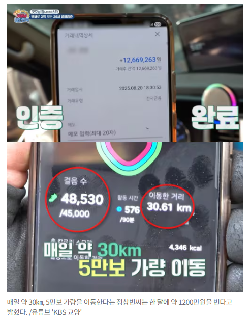 매일 약 30㎞, 5만보 가량을 이동한다는 정상빈씨는 한 달에 약 1200만원을 번다고 밝혔다. /유튜브 'KBS 교양'