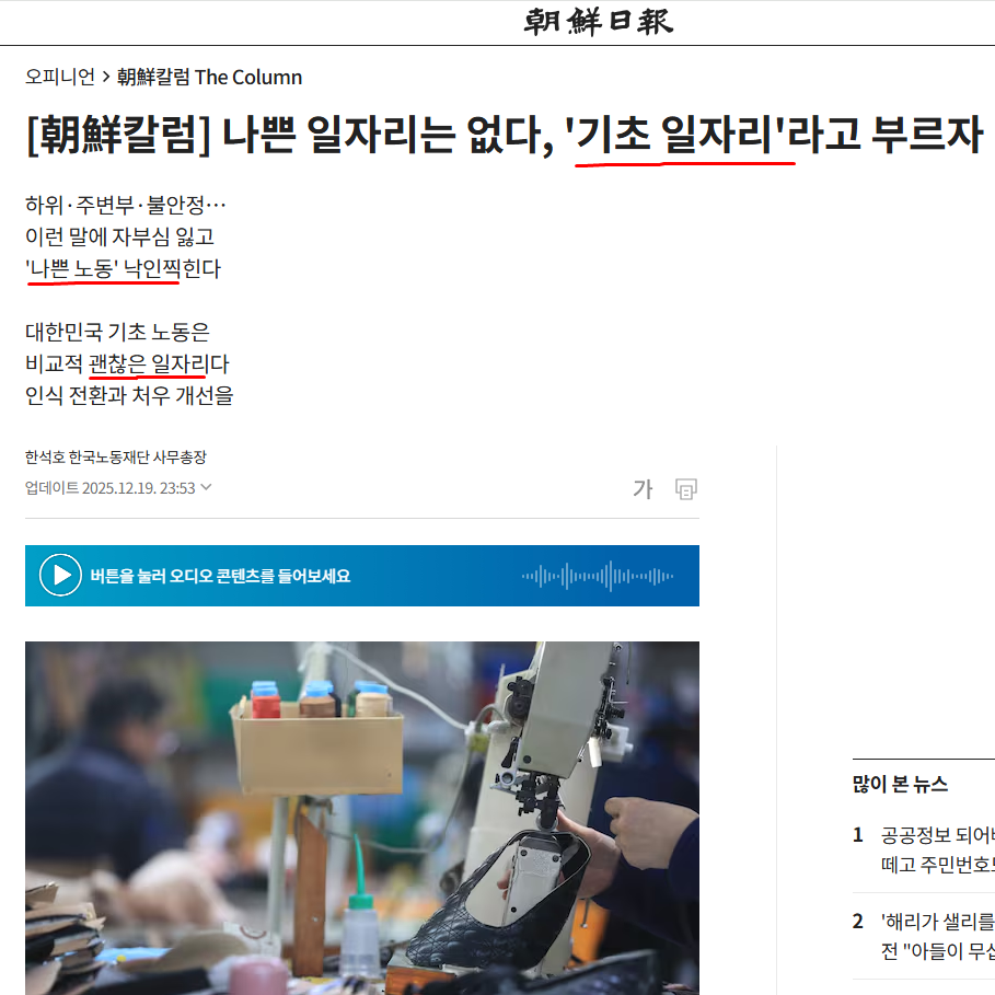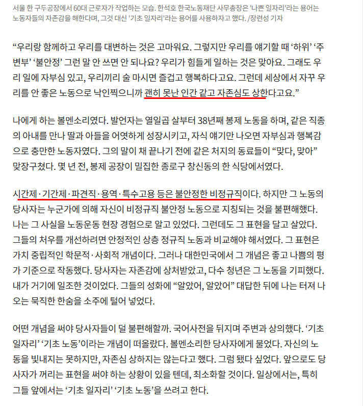 1) 한석호 주장. 시간제·기간제·파견직·용역·특수고용 일자리를 '불안정' 비정규직이라고 부르지 말고, 기초일자리라고 부르자.
