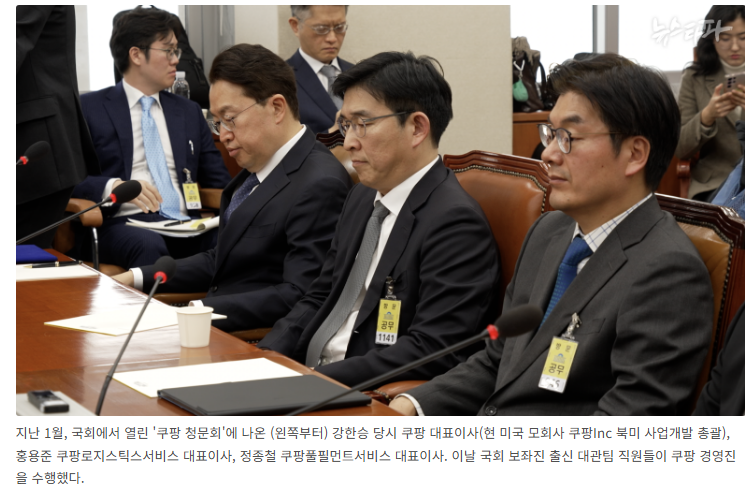지난 1월, 국회에서 열린 '쿠팡 청문회'에 나온 (왼쪽부터) 강한승 당시 쿠팡 대표이사(현 미국 모회사 쿠팡Inc 북미 사업개발 총괄), 홍용준 쿠팡로지스틱스서비스 대표이사, 정종철 쿠팡풀필먼트서비스 대표이사. 이날 국회 보좌진 출신 대관팀 직원들이 쿠팡 경영진을 수행했다.