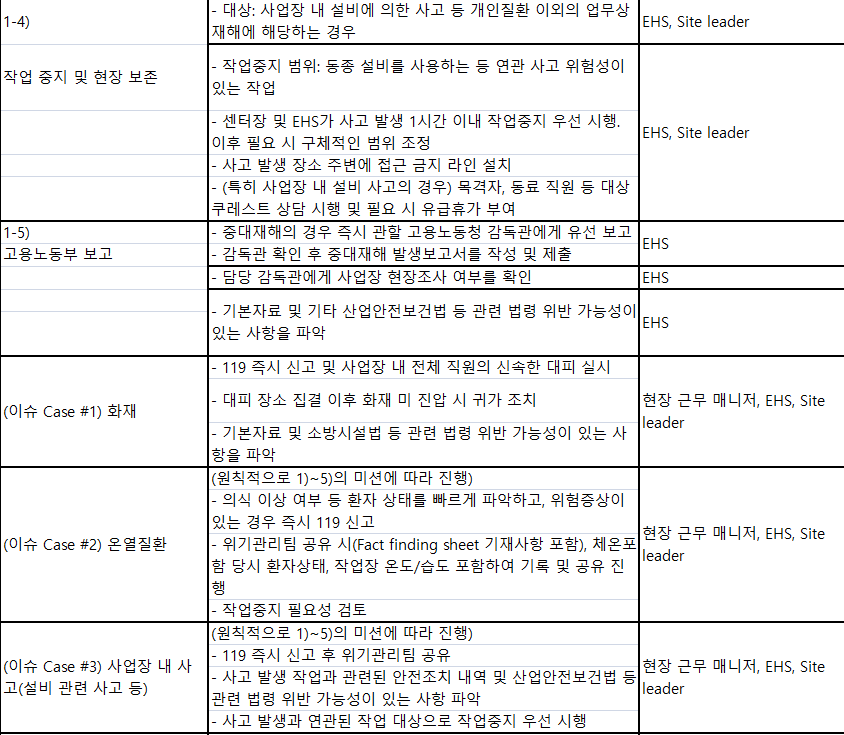 쿠팡의 위기관리 대응 지침 파일 안에는 '중대재해 발생 시 행동 지침'이란 제목의 자료가 있었다. 엑셀 표 형태로 작성됐는데, 쿠팡 사업장에서 노동자 사망 사고와 같은 중대재해가 발생했을 경우, 각 유관 부서가 어떻게 대처해야 하는지 적은 일종의 매뉴얼이었다.