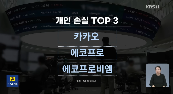 개인들이 많이 물린 상위 3대 종목을 확인해 보면, 카카오와 이차전지 관련 종목이 대부분이었습니다.