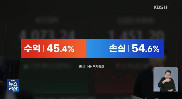 2025년 11월.11일. 주식 투자자. 개미 투자자 평가. 수익계좌( 45.4%) 대 '손실계좌 (54.6%)