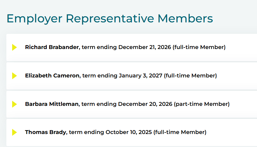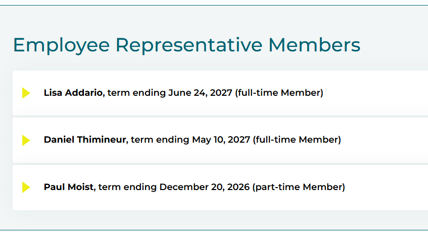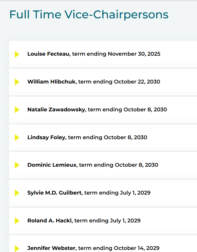 [캐나다 노동위원회 (=CIRB 캐나다 산업관계 위원회) 구성. 의장 1명, 부의장 8명, 파트타임 부의장 2명, 사측 대표 4명, 노동자 대표 3명, 중재자 위원 20명 여명