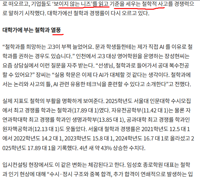 “철학과를 희망하는 고3이 부쩍 늘었어요. 문과 학생들한테는 제가 직접 AI 를 이유로 철학과를 권하는 경우도 있습니다.” 인천에서 고3 대상 영어학원을 운영하는 장성현씨는 요즘 상담실에서 이런 질문을 자주 받는다. “선생님, 철학과로 들어가서 공대 복수전공 할 수 있어요?” 장씨는 “실용 학문은 이제 다 AI가 대체할 것 같다는 생각이다. 철학과에서는 논리와 사고의 틀, AI 관련 유용한 테크닉을 훈련할 수 있다고 소개한다”고 전했다.
