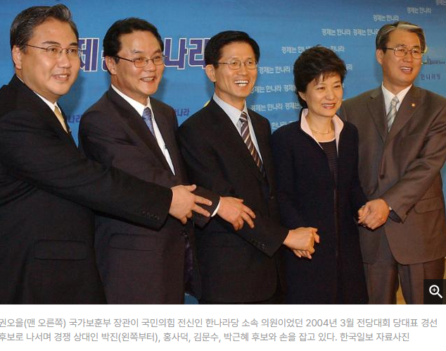 권오을(맨 오른쪽) 국가보훈부 장관이 국민의힘 전신인 한나라당 소속 의원이었던 2004년 3월 전당대회 당대표 경선 후보로 나서며 경쟁 상대인 박진(왼쪽부터), 홍사덕, 김문수, 박근혜 후보와 손을 잡고 있다. 한국일보 자료사진이미지 확대보기