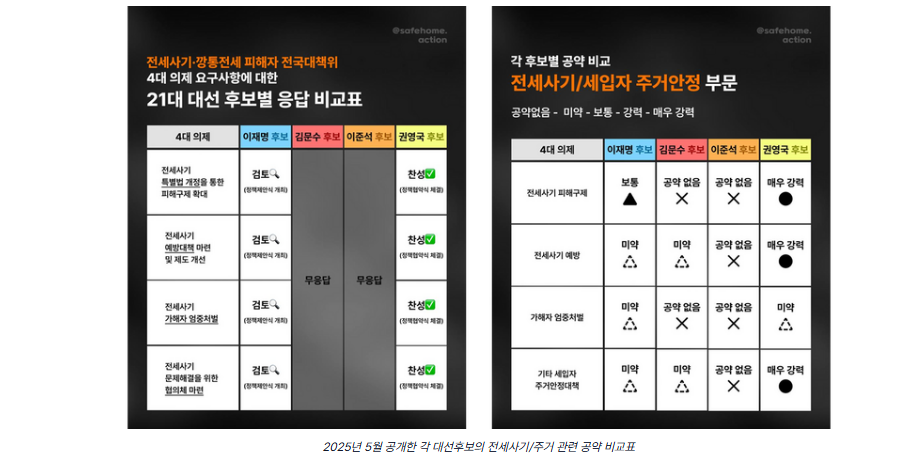 2025년 5월 공개한 각 대선후보의 전세사기/주거 관련 공약 비교표