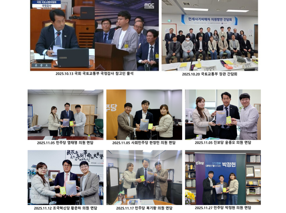 8월 이후 국토부 면담, 국회의원 면담에서는 위 요구사항을 지속적으로 전달하며 전세사기특별법 신속발의와 즉각처리를 요청했다. 특히, 10월 13일 국정감사, 10월 20일 국토부 장관 간담회, 11월 국회의원 연속 간담회를 통해 전세사기 피해자들의 절박한 현실과 요구사항을 지속적으로 전달하며 정부와 국회의 적극적인 역할을 당부했다.