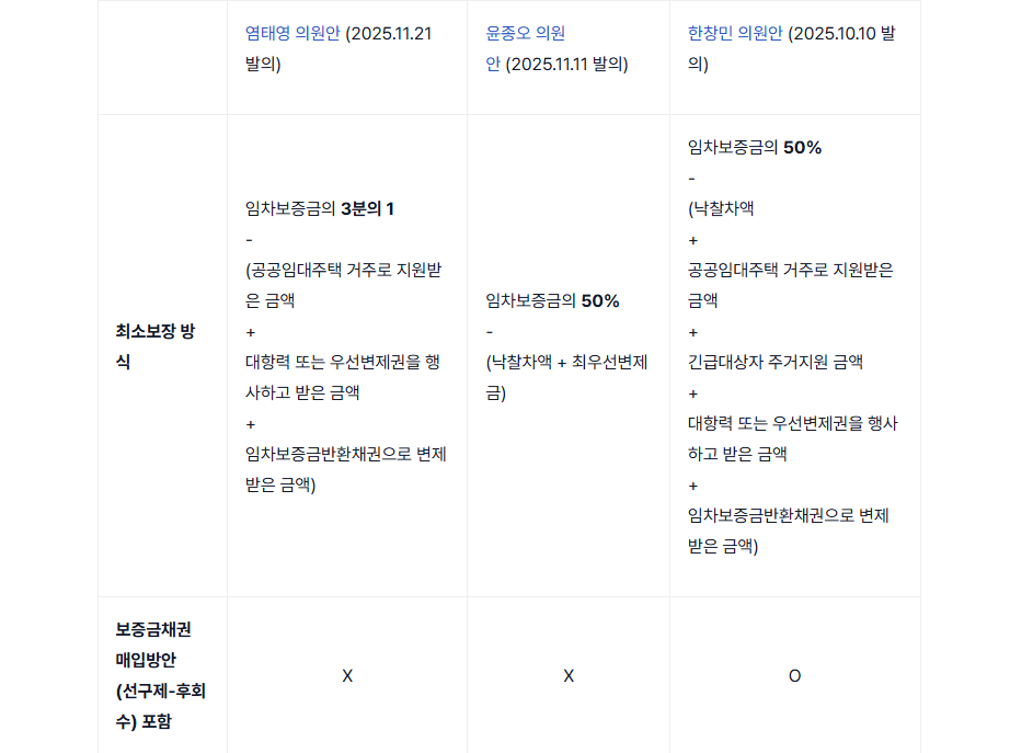 하지만, 이에 대한 입장은 정당마다 다르다. 사회민주당 한창민 의원과 진보당 윤종오 의원은 피해자대책위 입장을 수용하여 보증금의 50%를 최소보장하는 방안을 담은 특별법 개정안을 발의했다. 이에 비해, 민주당 염태영 의원은 보증금의 1/3을 최소보장하는 방안을 담은 특별법 개정안을 발의했다.