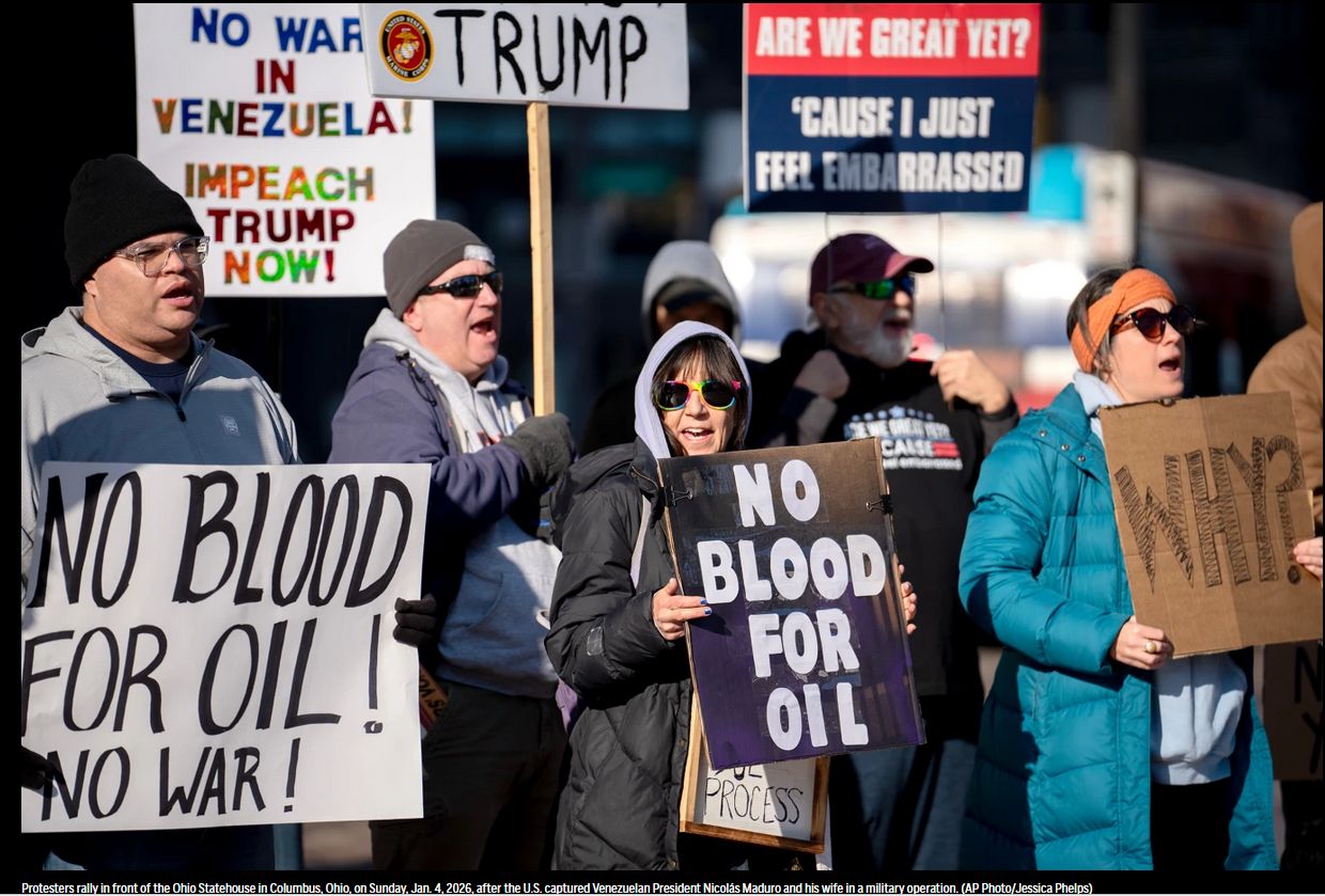 Protesters rally in front of the Ohio Statehouse in Columbus, Ohio, on Sunday, Jan. 4, 2026, after the U.S. captured Venezuelan President Nicolás Maduro and his wife in a military operation