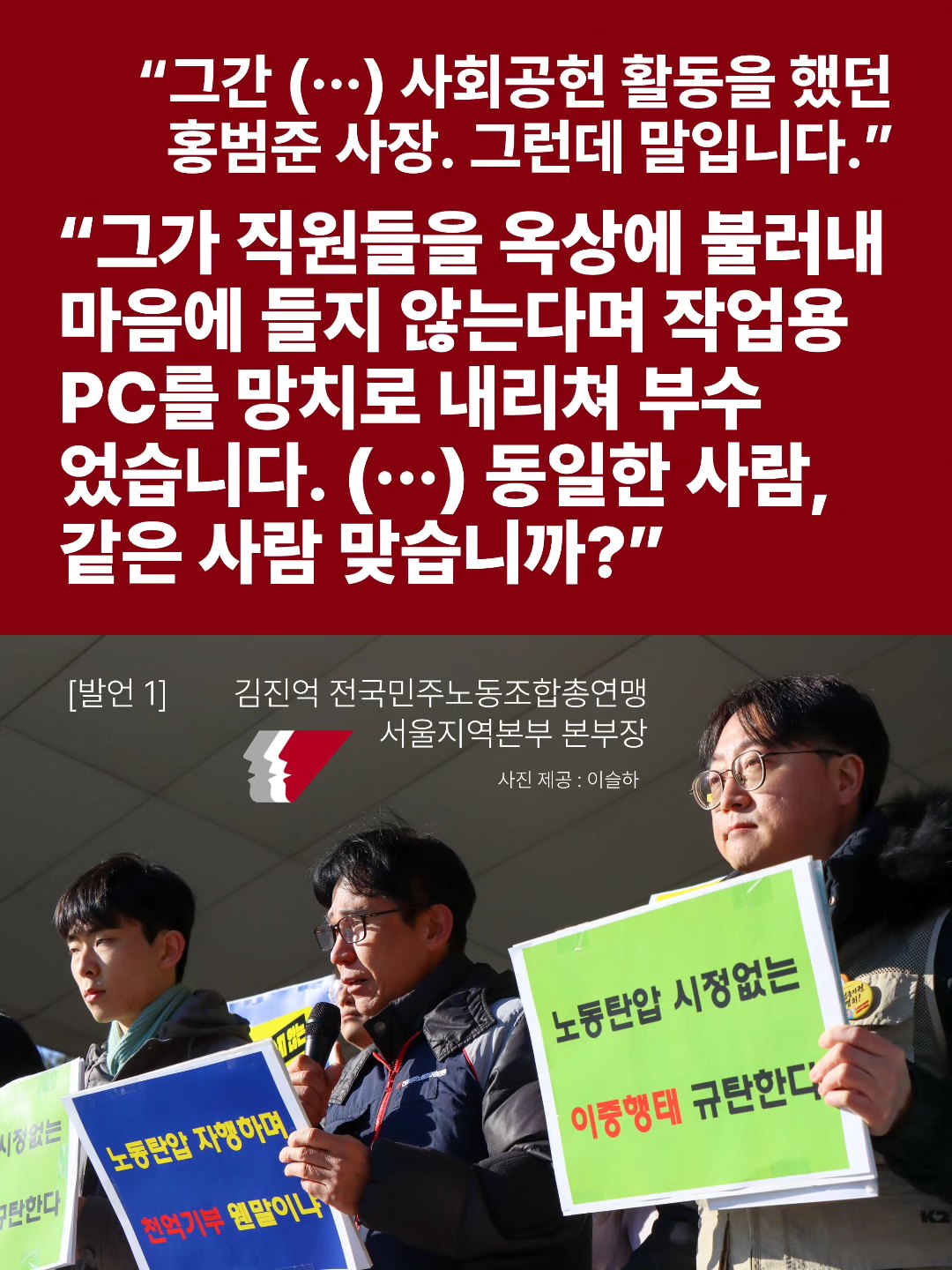 저소득층과 소외계층을 돕는데 앞장섰던 그가 직원들을 옥상에 불러내 마음에 들지 않는다며 작업용 PC를 망치로 내리쳐 부수었습니다. 직원들이 보는 앞에 메신저를 사찰하고 허위로 비난하고 폭언에 욕설까지 한 그 사람이 바로 홍범준 사장입니다.