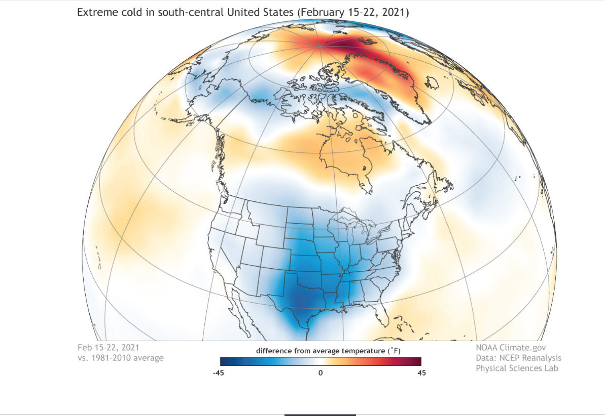 Near-surface air temperatures across the Northern Hemisphere from February 15–22, 2021, compared to the 1981-2010 average. The polar jet stream made a deep dive into the south-central United States, bringing extreme cold (dark blue) to the Southern Plains. Meanwhile, parts of the Arctic were much warmer than average (orange and red). NOAA Climate.gov image, based on NCEP/NCAR Reanalysis data from NOAA Physical Sciences Lab's daily composites tool.