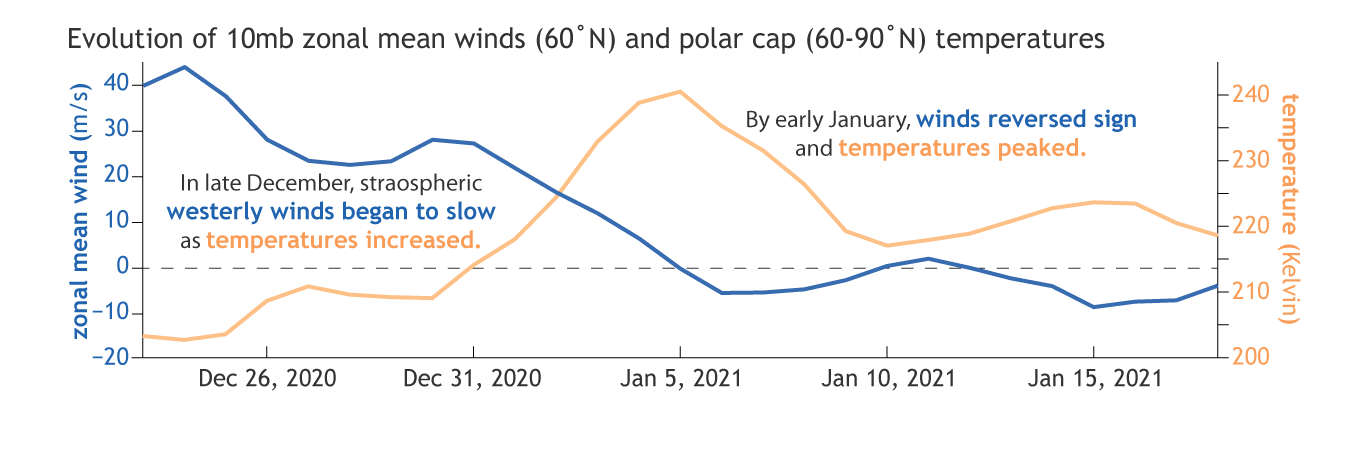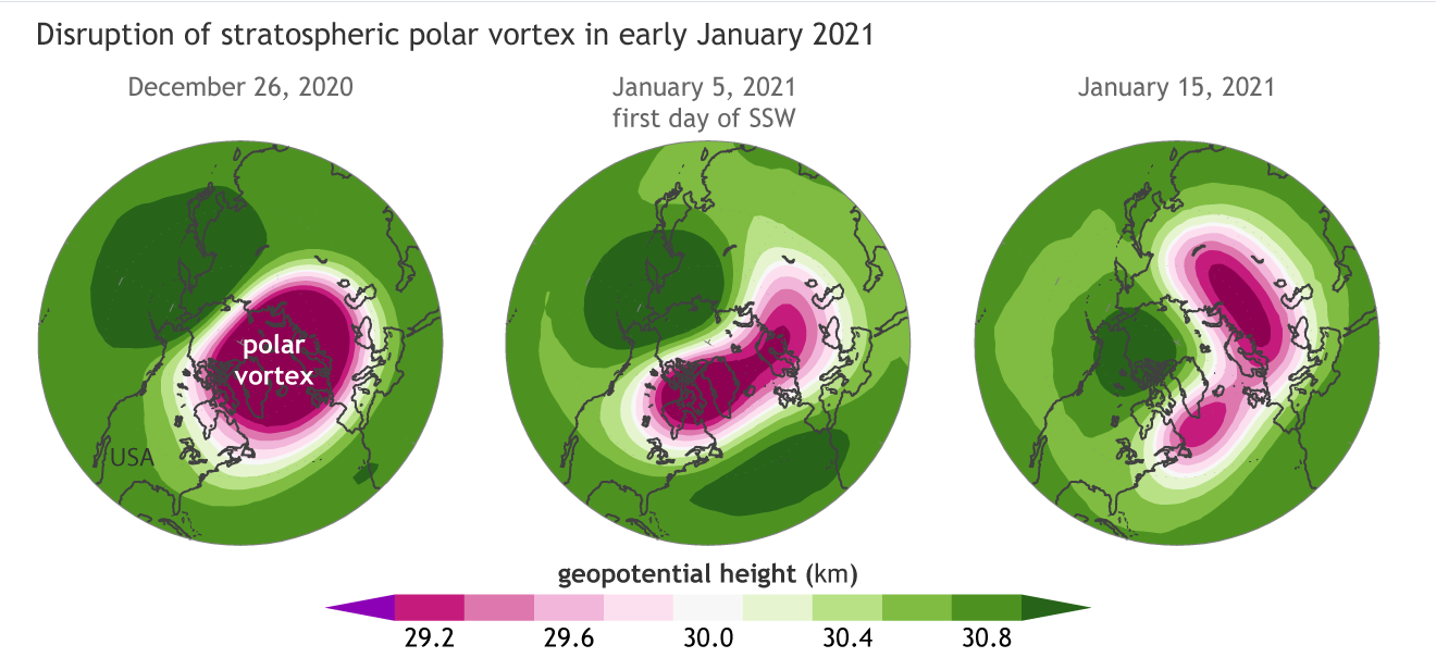 “We did have a sudden stratospheric warming in January,” explained Butler. “The polar vortex weakened. It got stretched out of shape and slid southward off the pole. Most of the time when this happens—and it happens on average about every other year in the Arctic—some part of the mid-latitudes will ultimately experience a cold air outbreak. The disruption of the vortex encouraged the polar jet stream to become wavier for several weeks, and in combination with other weather patterns, created favorable conditions for a severe cold air outbreak in the central U.S.”