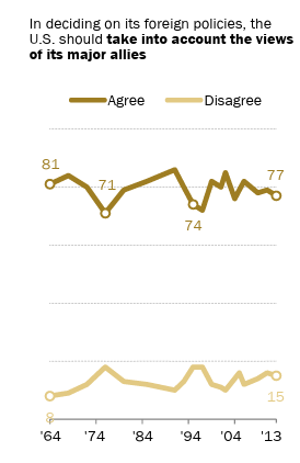2013 미국 동맹국과의 관계 설정 조사 77% 동맹국과 협력
