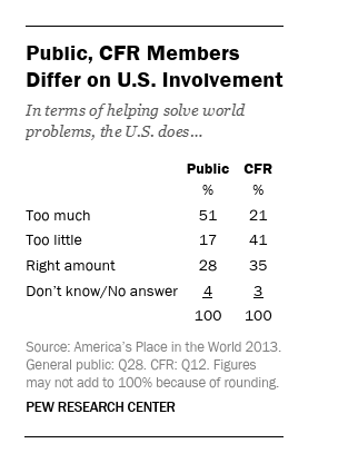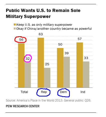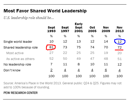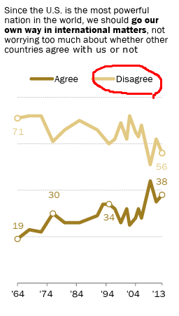 (2) 기존 '좋은 헤게몬' 역할 반대. 미국의 경찰국가 역할 반대. 미국 자국우선주의 여론 강화 (52%). 국제개입보다는 자국 정치경제 집중해야 한다. 남의 나라는 '미국 개입없이' 스스로 알아서 잘 살도록 내버려 두라.