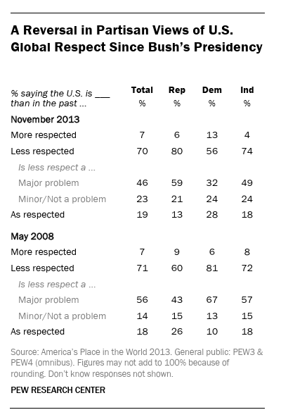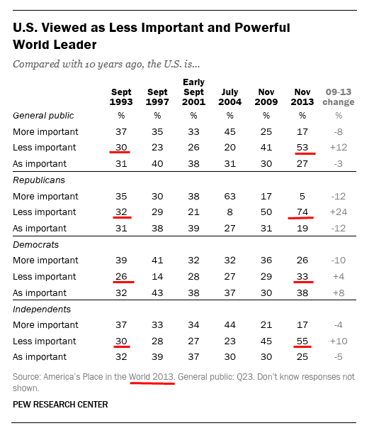 2013 미국 국제 리더 지위 약해졌다 인정 정당별