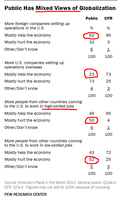 (5) 국제 무역과 통상 협력체제 강화 찬성 77%. 미국의 '고립주의'는 찬성하지 않음. 미국의 GDP가 중국의 2배임에도, 가파른 중국의 성장에 우려