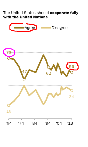 미국은 유엔과 협조해야 한다 73%에서 56%로 감소