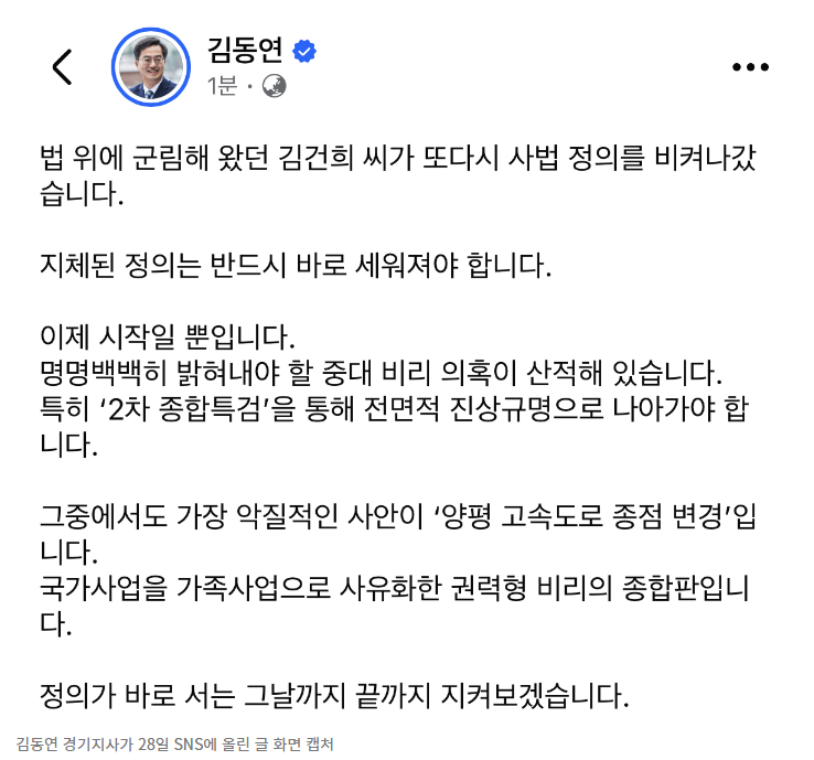 앞서 김 지사는 경기도정 브리핑 등을 통해 양평 고속도로 노선 변경 과정의 불투명성을 수차례 지적해온 바 있다. 이번 선고를 계기로 경기도와 직접 연관된 '양평 의혹'에 대한 특검 필요성을 다시 한번 공론화하겠다는 의도로 풀이된다.