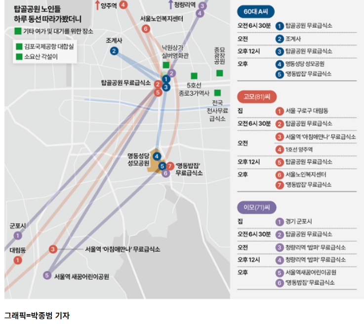 한국일보는 지난 연말 2주간 탑골공원 인근에서 노인 20여 명을 만나 그들의 일상을 추적했다. 탑골 노인들의 일상은 반년 전보다 훨씬 외롭고 파편화돼 있었다. 지하철, 대형 종교시설 등 시선이 집중되지 않는 곳에 홀로 숨어들었고, 하루 일과 전체를 무료급식에 맞춰 재편하기도 했다.