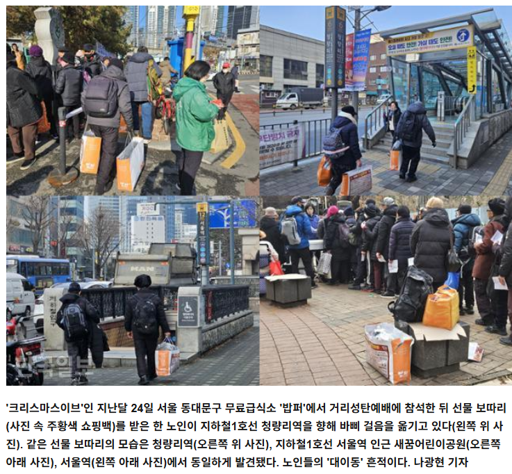 '크리스마스이브'인 지난달 24일 서울 동대문구 무료급식소 '밥퍼'에서 거리성탄예배에 참석한 뒤 선물 보따리(사진 속 주황색 쇼핑백)를 받은 한 노인이 지하철1호선 청량리역을 향해 바삐 걸음을 옮기고 있다(왼쪽 위 사진). 같은 선물 보따리의 모습은 청량리역(오른쪽 위 사진), 지하철1호선 서울역 인근 새꿈어린이공원(오른쪽 아래 사진), 서울역(왼쪽 아래 사진)에서 동일하게 발견됐다. 노인들의 '대이동' 흔적이다. 나광현 기자