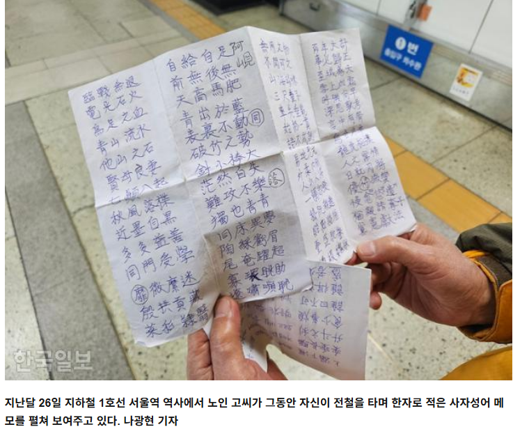 지난달 26일 지하철 1호선 서울역 역사에서 노인 고씨가 그동안 자신이 전철을 타며 한자로 적은 사자성어 메모를 펼쳐 보여주고 있다. 나광현 기자