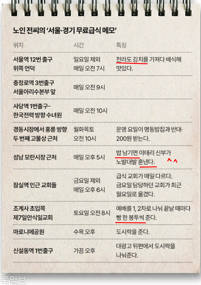 하루 시간표의 빈 부분을 다른 무료급식으로 채워버리는 노인들도 적지 않았다. 이들은 세 끼를 제외한 남는 시간에 다른 급식소 등으로 끊임없이 이동했다. 지난달 21일 오후 '명동밥집' 무료급식소에서 만난 전모(72)씨의 머릿속엔 '무료급식 데이터베이스'라도 있는 듯했다. 전씨는 "서울아리수본부 앞 매일 오전 9시"(구세군), "사당역 1번 출구에서 한국전력 방향 매일 오전 10시"(까리따스 수녀회), "경동시장에서 홍릉쪽 올라가는 길 두 번째 고물상 근처로 명동밥집(수·금·일)과 반대 요일(월·화·목·토) 오전 11시, 200원씩 받는다"(프란치스꼬의 집), "성남 모란시장 근처 오후 5시, 밥 남기면 이태리 신부가 혼낸다"(안나의 집) 등 서울·경기 지역의 주요 무료급식 위치와 운영 시간, 특징을 줄줄 읊었다.