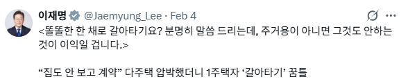정부의 다주택자 압박 영향으로 1주택자들이 이른바 '상급지'로 갈아타려고 한다는 내용의 기사를 공유한 뒤, "똘똘한 한 채로 갈아타기도 주거용이 아니면 안 하는 것이 이익일 것"이라고 경고했습니다.