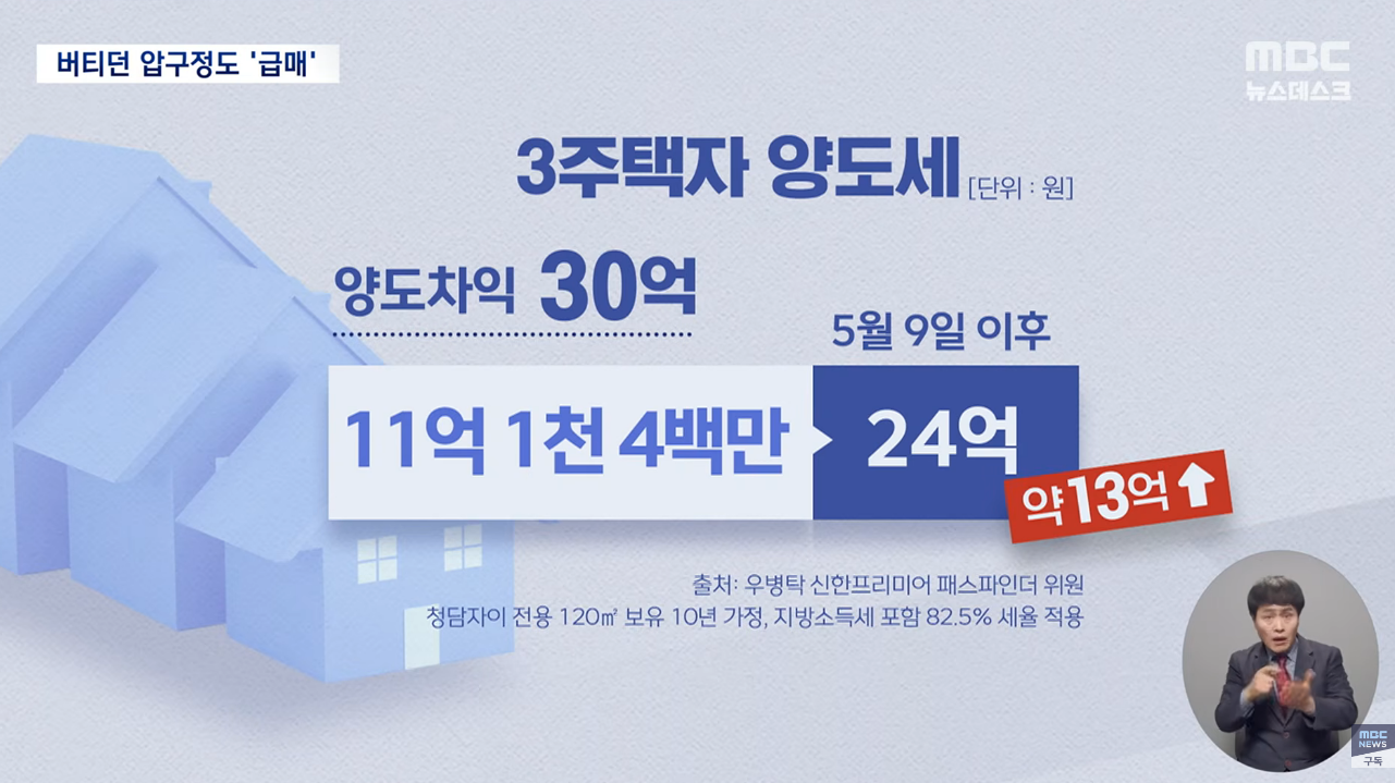 30억 원의 차익을 거둔 다주택자가 5월 9일이 지나 매도할 경우 부과되는 양도세는 24억 원, 지금보다 13억 원이 늘어납니다.