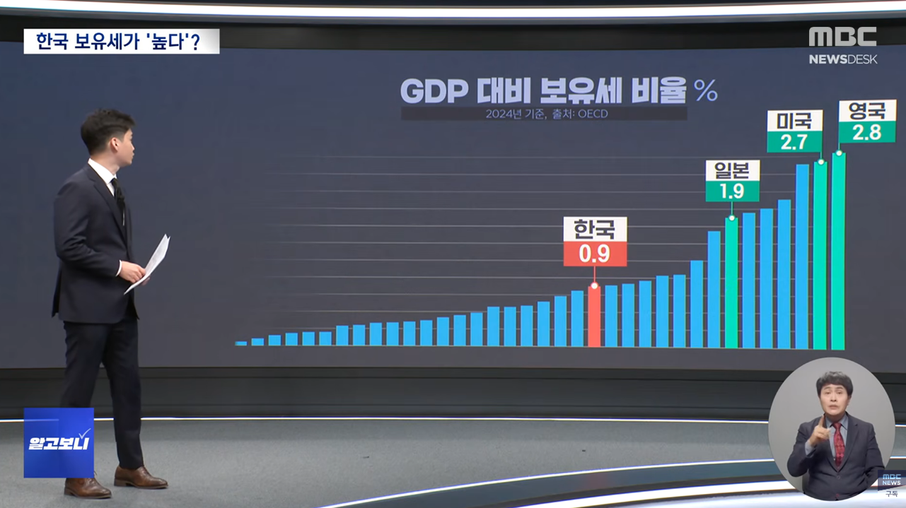 보유세가 0.8%가 넘는 캐나다, 영국과 비교하면 한국은 4분의 1도 되지 않고, 0.5%대인 일본, 프랑스의 3분의 1 수준에 불과합니다.