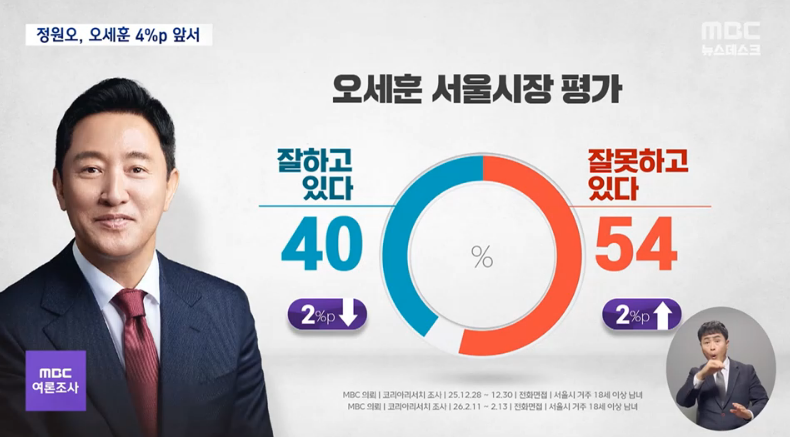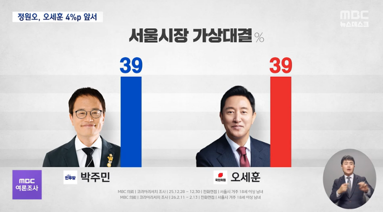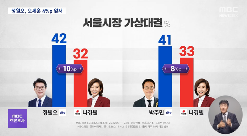 서울시장 선거 가상 양자대결에서는 여권의 정원오 성동구청장이 오세훈 현 서울시장을 오차범위 안에서 앞서는 것으로 조사됐습니다.