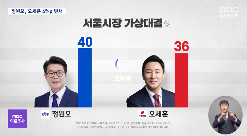서울시장 가상 양자대결‥정원오 40% VS 오세훈 36%