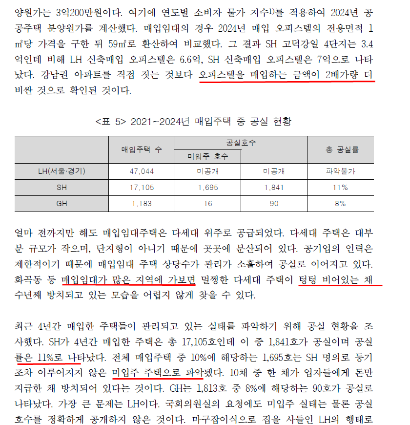 (1) 재정 낭비. SH 가 (25평형) 아파트 신축한 분양원가는 3.4억원, LH 매입 오피스텔 6.6억원 SH 매입 오피스텔 7억원.