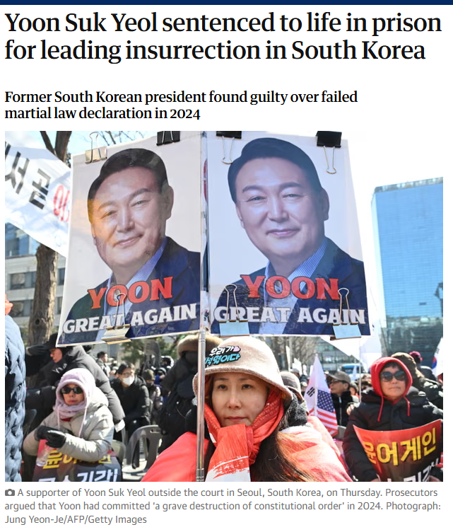 On 12 February, the former interior minister Lee Sang-min was jailed for seven years for his role in the insurrection, including relaying Yoon’s orders to cut power and water to media outlets.