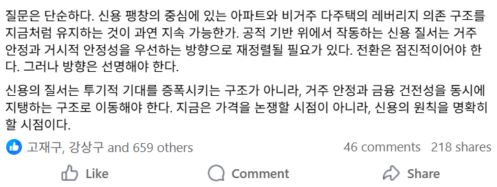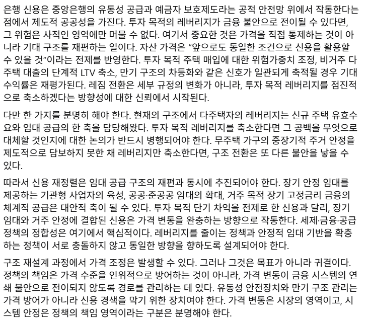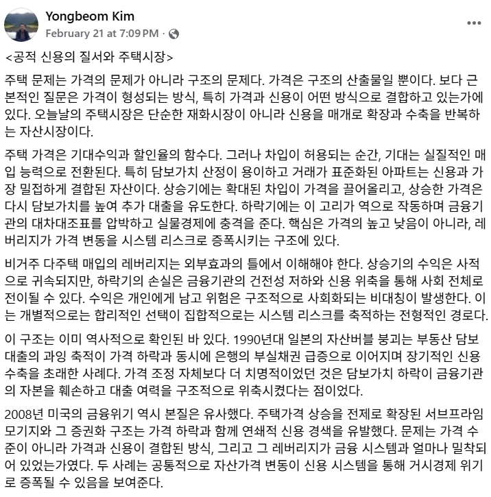 신용의 질서는 투기적 기대를 증폭시키는 구조가 아니라, 거주 안정과 금융 건전성을 동시에 지탱하는 구조로 이동해야 한다. 지금은 가격을 논쟁할 시점이 아니라, 신용의 원칙을 명확히 할 시점이다.