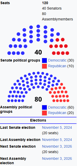 캘리포니아 주지사도 민주당원, 주의회는 민주당 의원들 (하원 80명, 상원 40명 정원에, 하원은 60명, 상원은 30명이 민주당임)