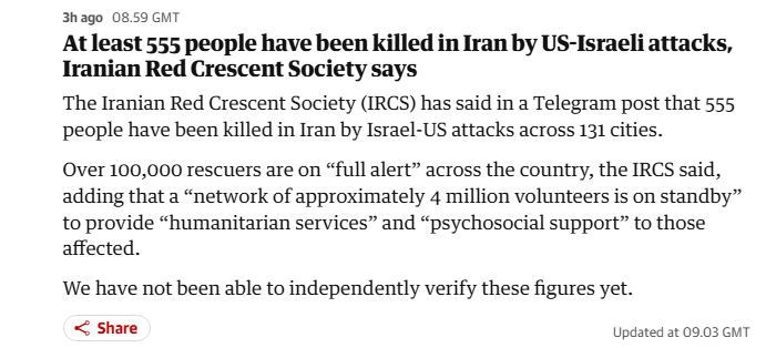3월 2일 미국과 이스라엘이 이란의 131개 도시에 폭력. 최소 555명 사망. 10만명 이란인들이 구호활동 중. 400만명의 자원 봉사자들이 인도주의 치료와 심리적 지원 준비중.