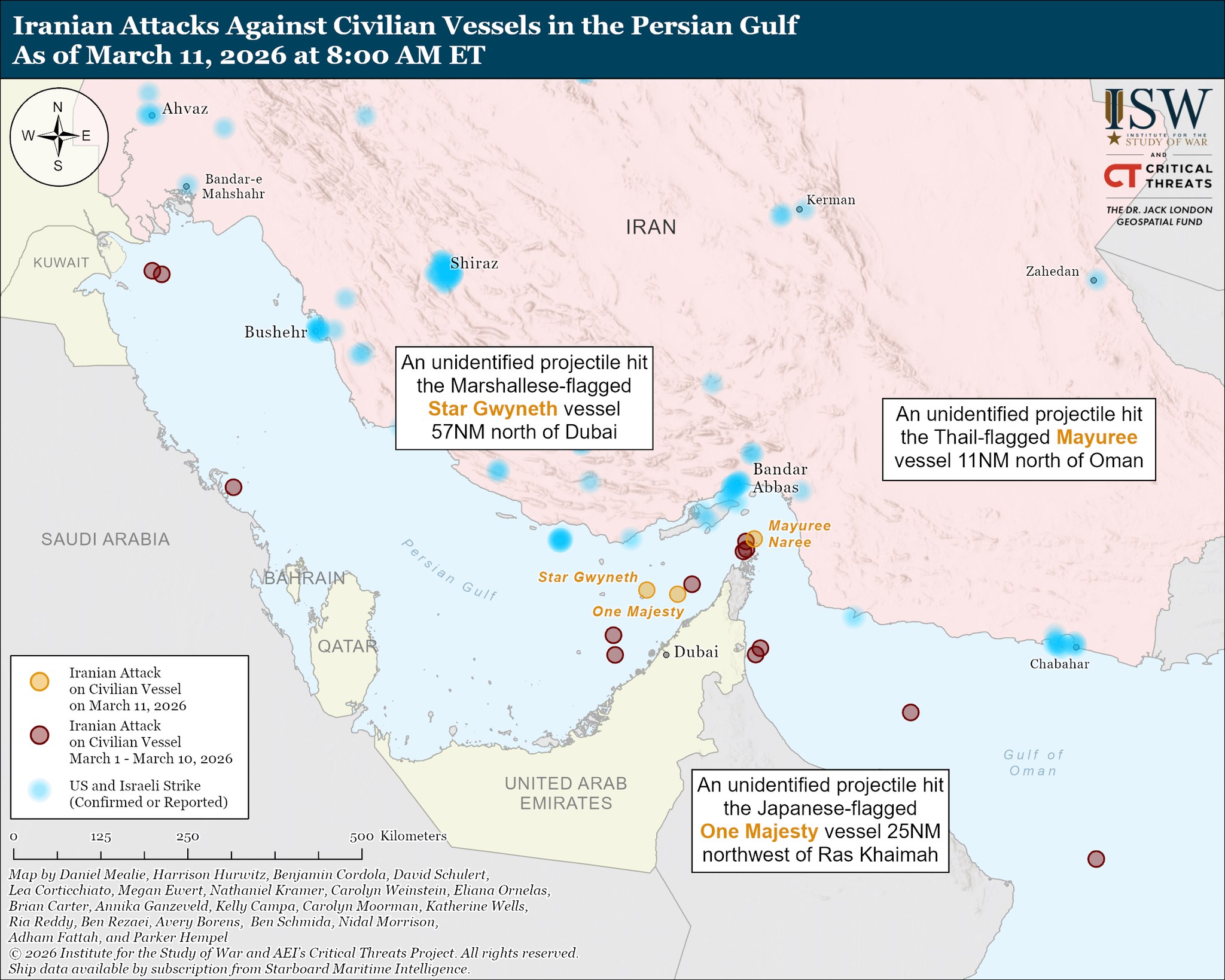 A likely Iranian drone also struck an unspecified bulk carrier off the coast of Dubai, United Arab Emirates (UAE), on March 11 damaged the ship but did not cause casualties.[7]