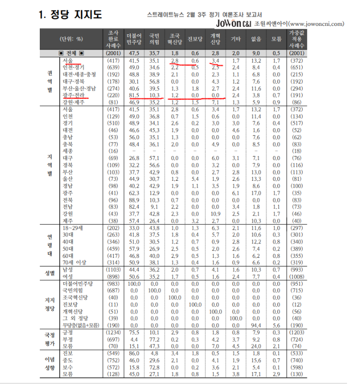 민주당 47.5%, 국민의힘 35.7%, 조국혁신당 1.8%,개혁신당 2.8% 진보당 0.6%,