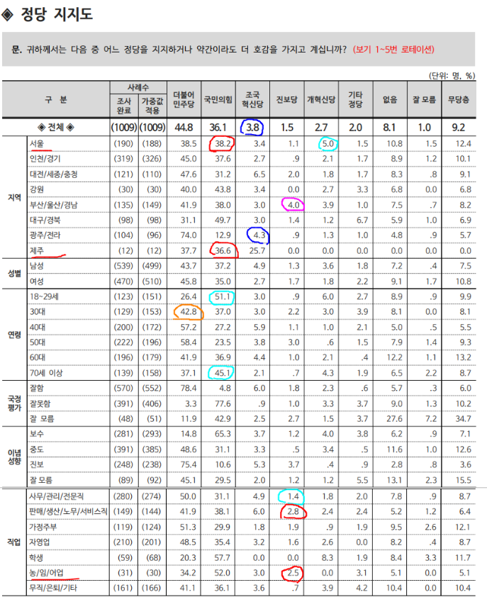 민주당 44.8%, 국민의힘 36.1%, 조국혁신당 3.8%, 개혁신당 2.7%, 진보당 1.5% 무당층 9.2%