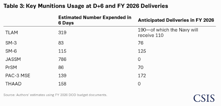 Tomahawk: Using 319 Tomahawks would nearly empty the missile magazines of the U.S. Navy ships in the region. The authors previously estimated that the Navy had about 3,100 Tomahawks available, including those aboard ships. Estimated expenditures in the first six days of Operation Epic Fury would take the inventory down to about 2,700. In FY 2026, 190 Tomahawks are slated for delivery. Of these, 64 are intended to go to the Army and 16 to the Marine Corps.